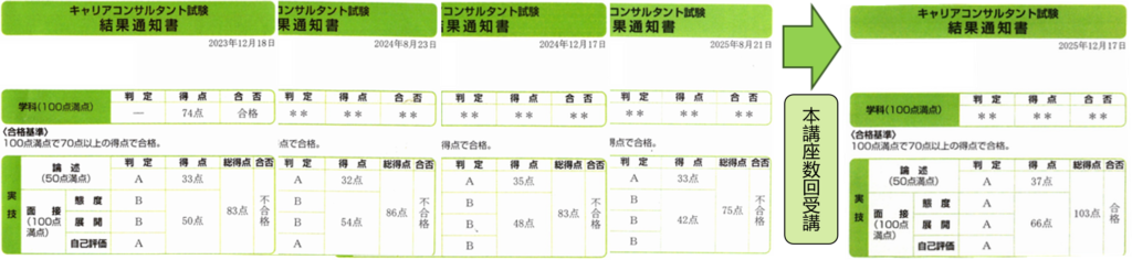4回不合格が続いていた受検者の方が、知人の1級技能士の方のご紹介で受講されました。決して努力をしていなかったわけではありません。むしろ、誰よりも真剣に取り組んでいました。ただ、少しだけ努力の方向がずれていました。数回対面講座に参加することで、面談の捉え方を再整理しその後の受検で合格されました。「同じように悩んでいる方に、諦めないでほしい」そのご本人の強い希望により、実際の成績推移を掲載させていただきます。